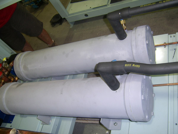 DX chillers range in capacity from 18 to 350 Kw capacity. They are unique in that they are made with “U” shaped tubes which enable cleaning of the water side. Robust in construction and serviceable, they are built to last. The water side can pass quite large particles of matter without obstruction thus maintaining its efficiency; an important factor in the long life of the unit.